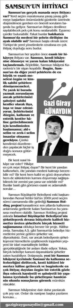 Samsun’un her şeyden önce esaslı bir hikâyeye ihtiyacı var. Samsun, kendi hikâyesine dönmeye ve yarım kalan hikâyesini taçlandırmalı. Böylelikle, Samsun hikâyesi Karadeniz’e bir nişan koyabilir. Bugün, Samsun’un da diğer yerel şehirlerin de en büyük ve esaslı meselesi özgün ve kimlik sahibi şehirlere dönüşememeleri. Ne yazık ki burada yazmak zorundayım ancak şehirlerimizi şahsiyet sahibi kentler olarak ihya, inşa ve imar edemiyoruz. Şehirlerimizi düzgün, kalkınan ve estetik kentler hâline getirebilmemiz için kendimizden başlamamız; akl-ı selim ve zevk-i selim insanlar olmamız gerekiyor. Çünkü kendimizi düzeltmeden yapılacak hiçbir iş doğru sonuca götürmeyecek.